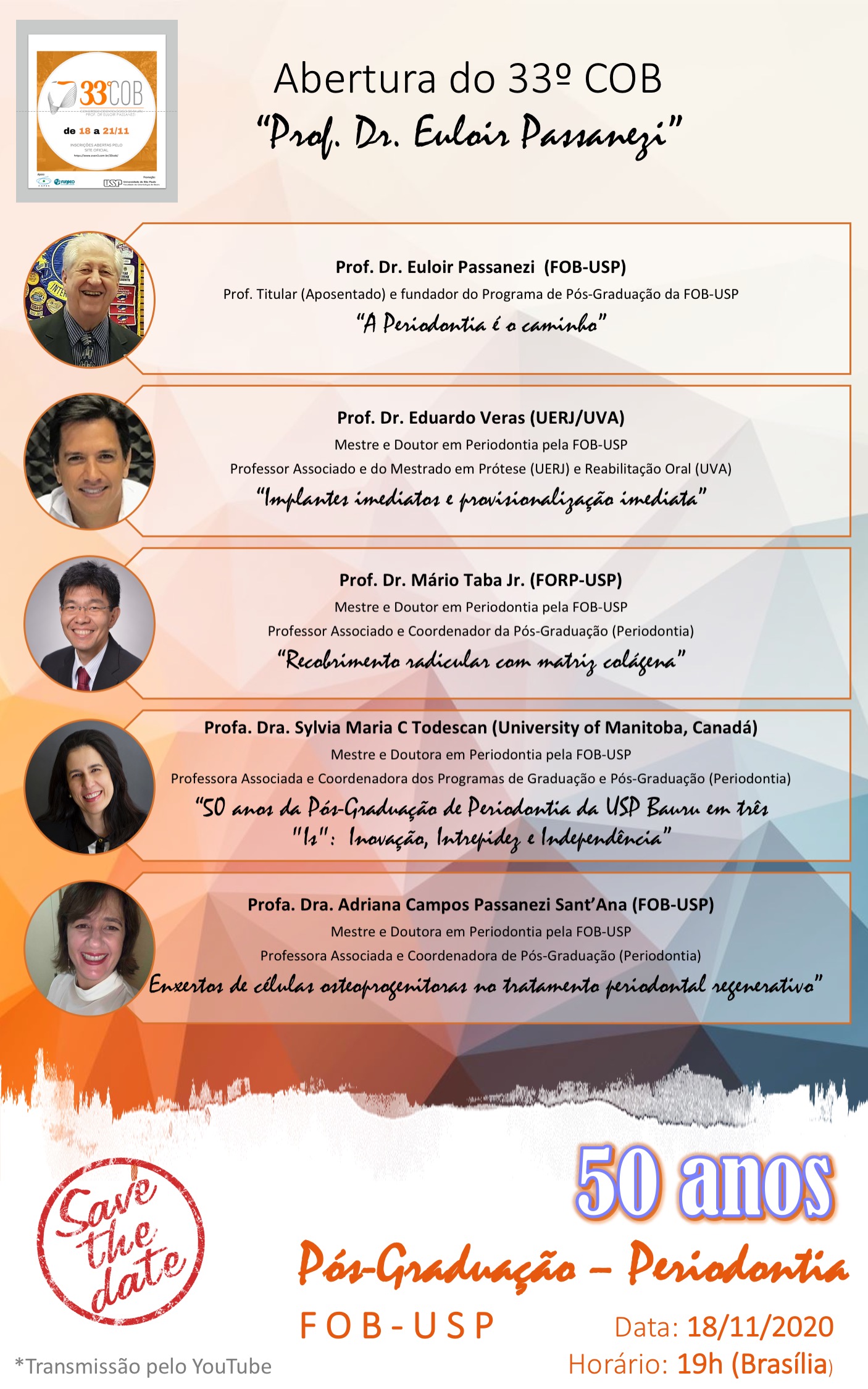 Na abertura do Congresso, a ser realizada no dia 18 de novembro de 2021, teremos uma palestra pré-congresso de acesso gratuito, pelo YouTube, onde será comemorado os 50 anos da Pós-Graduação em Periodontia da FOB-USP.