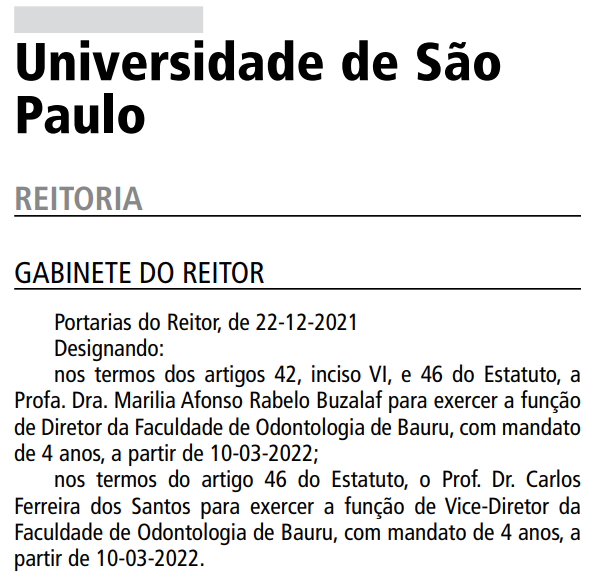 O reitor da USP, Vahan Agopyan, designou, conforme publicação no Diário Oficial do Estado de São Paulo (22/12/2021), a professora Marília Afonso Rabelo Buzalaf para exercer a função de Diretora da FOB-USP nos próximos 4 anos.